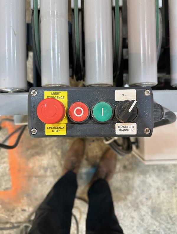 Transfert par courroie et rouleaux de réception motorisés à mouvement vertical pneumatique. Lorsque la fin de la planche est détectée, les rouleaux du convoyeur de réception se rétractent et la planche est déplacée vers les rouleaux de retour par la courroie de transfert.