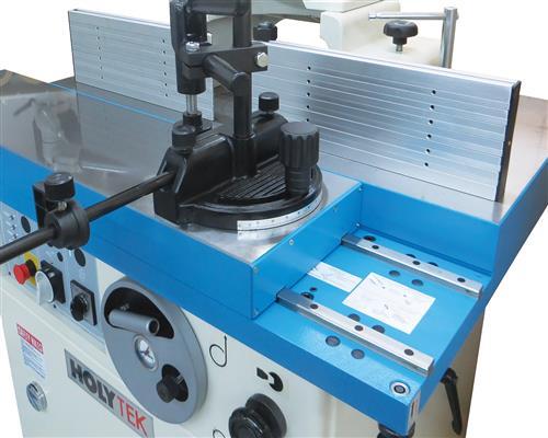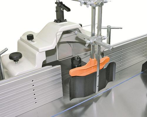 Guide à onglets ajustable en fonte massive avec pied presseur, rallonge et butée.