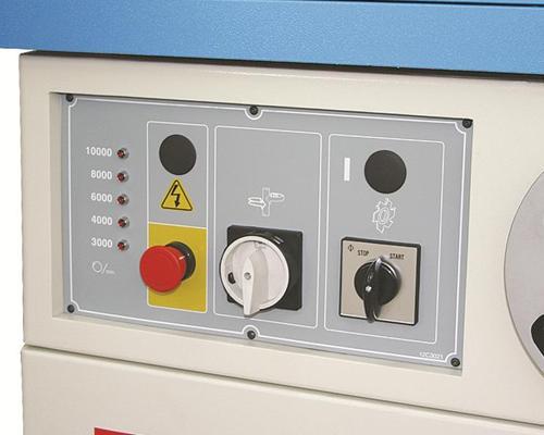 Panneau de contrôle avec interrupteur rétroavance, bouton d'arrêt d'urgence et afficheur lumineux de la vitesse de rotation de l'arbre.